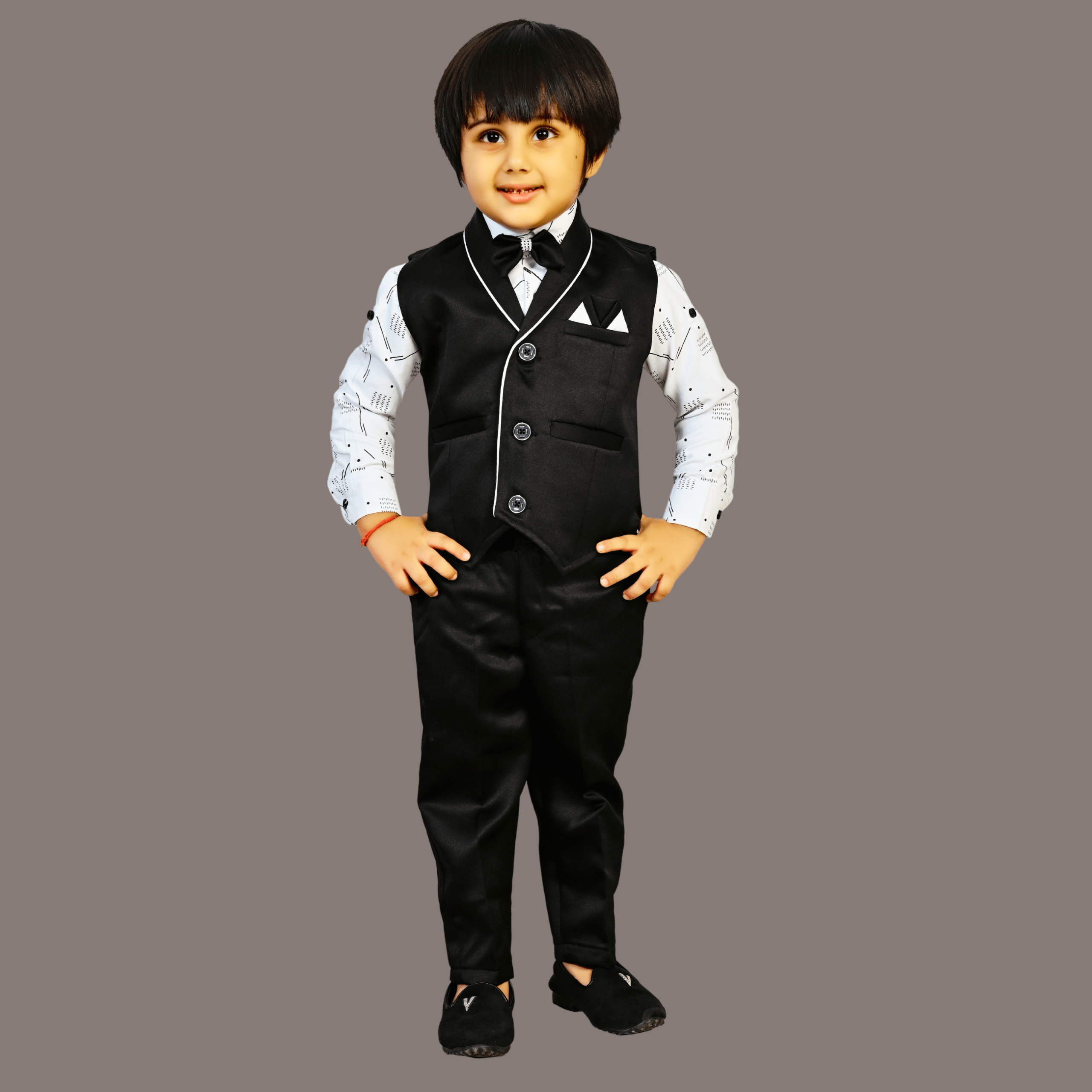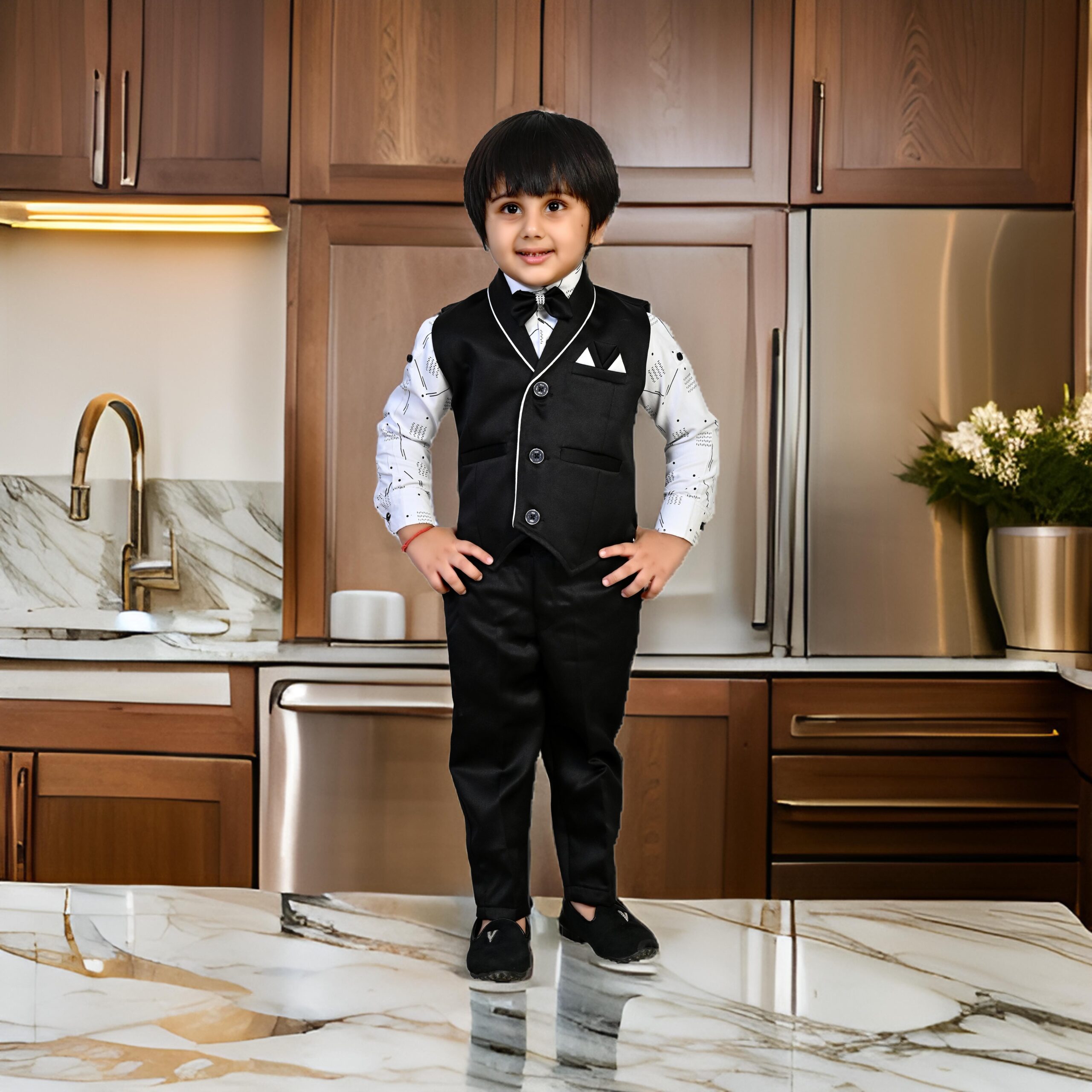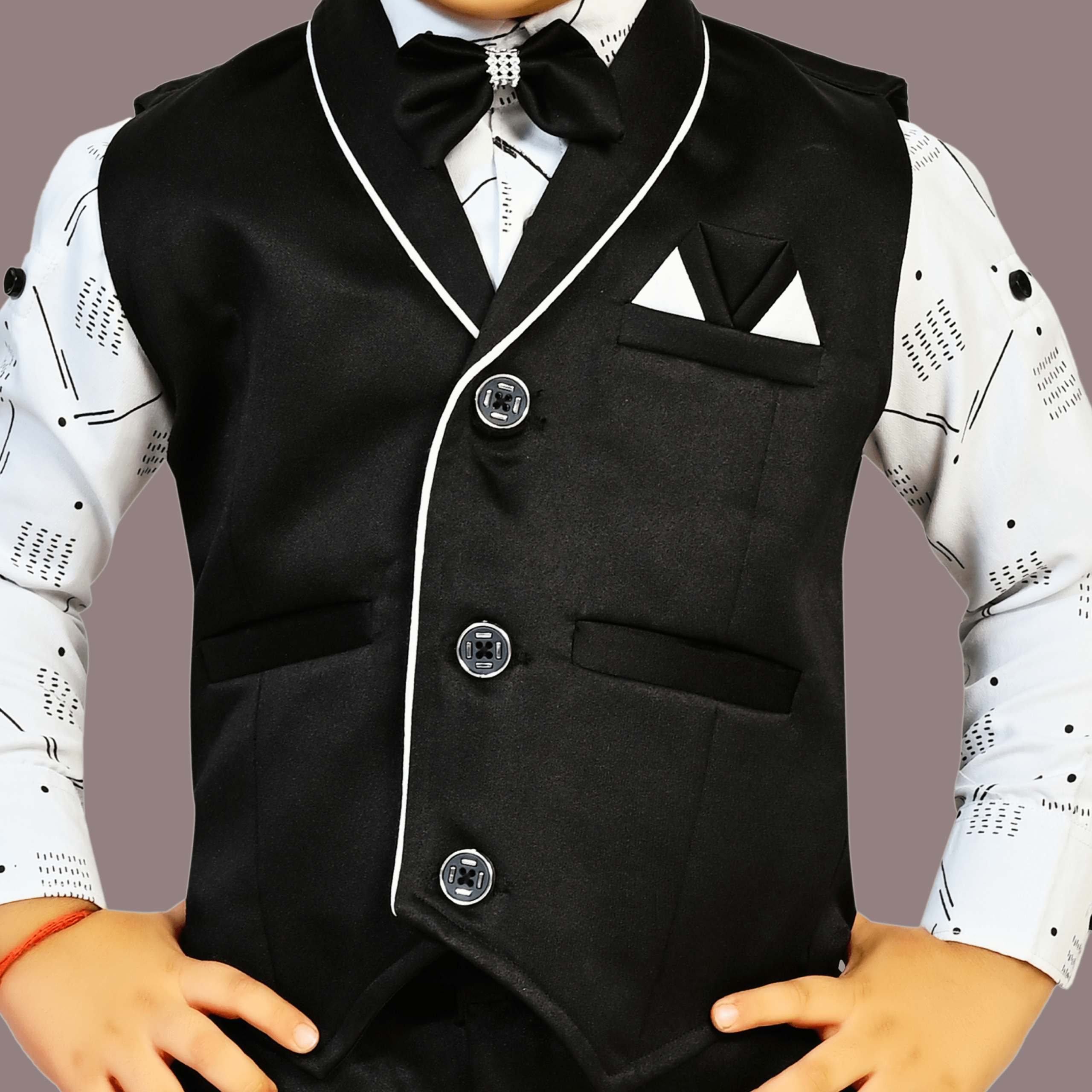 - Eegant Design: A Stylish Boys 3 piece party wear dress_ Romeo Star featuring a well-fitted waistcoat with sleek white piping for a enlightened and polished look.